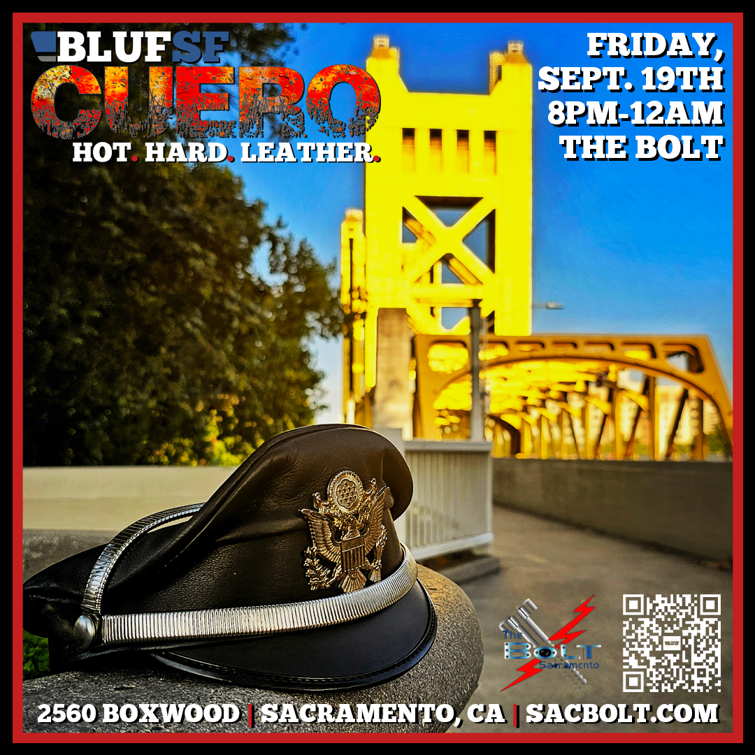 Regarding Sacramento events, CUERO will be returning more regularly and will be augmented by dinner socials when we do not have the Bolt. We will support events that are going on at the Bolt but we will also do our own thing. The big change to Sacramento is that CUERO nights are being moved to Saturdays to allow maximum attendance from Sacramento and San Francisco folx alike.