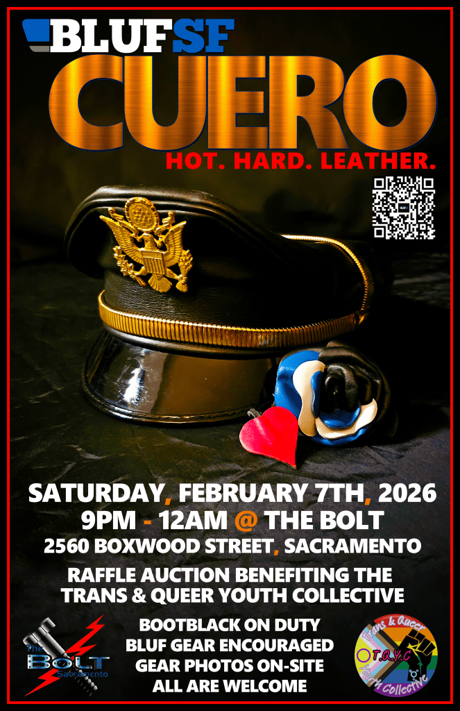 BLUFSF CUERO begin in May 2025 following a successful collaboration with 2025 Mr. Bolt Leather Colin Gallagher in March 2025. CUERO is a sibling event to BLUFSF HARD and is held at the Bolt, Sacramento’s Leather bar.